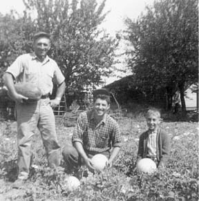 In September 1961, from left to right, Aldo Rossi holding a watermelon, Agostino Augie Giusto and Aldo's nephew Richard Alfieri pose with ice cream melons, a type of melon similar to honeydew melons, and common in the day. Italian farmers grew melons and cantaloupes in Portland until the mid-1960s, at which time a soil virus totally eliminated the ability to produce the crop to this day. This photo was taken at the then Rossi-Giusto Farm, with the bunkhouse in the background; the location was on Buckley Avenue, now Northeast 122nd Avenue, in the Parkrose area of what is now Northeast Portland.