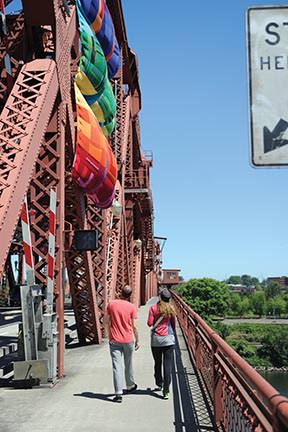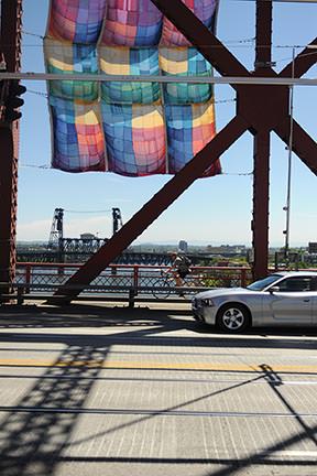 Parkrose native Tyler Mackie, who created the art installation, represents a bridging of expressions as well. With both parents silversmiths, one grandmother possessing a green thumb while the other was craft-based, art was omnipresent in her life. I took an intro to art class and they brought up this point about the division between fine art and craft and it felt like that established my mission statement right there, said Mackie. They identified the division in the textbook as craft is function and fine art is a visual feast and I wanted to figure out how they could be both. In 1999, after graduating from Parkrose High School, Mackie earned a Ford Family Foundation scholarship to study costume design at Oregon State University. While creating costumes for the OSU Theater, she studied painting and drawing. After OSU, Mackie pursued a graduate degree at Louisiana State University in Baton Rouge, completing her graduate thesis on sculptural craft-based fiber work. Mackie started bridging craft with fine art by integrating embroidery with painting, but has lately moved away from painting, forming her pieces entirely in fabric. Currently quilting and crocheting, she has joined a trend of young women, or young in relation to the age most associated with knitting, crocheting, quilting and the like, who have revived the craft of fabric work by transcending its conventions. While traditional fabric craft applications involve clothing articles or homewares, some contemporary fabric craft artists have endeavored to soften the public landscapes of urban areas with a practice known as yarn bombing. The unsanctioned public art pieces (think fabric graffiti) have grown into a worldwide phenomenon, annually celebrated on International Yarn Bombing Day, which first took place in June of 2011. The yarn bombs themselves assume many forms, but most commonly feature knit sleeves of patterned yarn encircling poles of street signs, park trees, bike racks and the like. Knitted by local yarn bomber Commuknitca-tion, one such sleeve, caught Mackie's attention on the eastbound walkway of the Broadway Bridge. It brought to mind a piece she had seen by the Portuguese artist Joana Vasconcelos, who draped a 49 foot by 115 foot handmade cotton crochet bib over the high arching Dom Luis bridge in Porto, Portugal. Mackie felt inspired to honor the Broadway Bridge with a similar piece made of brightly colored knit banners hanging down from the bottom portion of the bridge towards the water. Unlike murals, such fabric-based artwork would have a necessary expiration date, but, since it employs knitwork, Mackie wanted the art to serve a dual purpose as blankets donated to homeless shelters after the piece was retired from public view. Initially, she contacted the Regional Arts and Culture Council seeking a grant for the temporary installation, but then a fellow knitter mentioned that she should submit it to the PDX Bridge Festival. Founded in 2010 in recognition of the Hawthorne Bridge's centennial, the PDX Bridge Festival celebrates and educates on the Willamette bridges by sponsoring a range of events which have varied each year in recognition of the different bridges it celebrates. The first festival also featured a fabric-themed art piece. Reviews on the lights triggered by traffic illuminating white canvas panels on the Hawthorne Bridge were mixed. The 2011 festival repeated the popular 'brunch on the bridge' event from 2010 and added a block party to its features, but limited funding and a shortage of volunteers curtailed the 2012 and 2013 celebrations. This year's festival to commemorate the centennial of the Broadway Bridge began with cake at the Rose Quarter on its birthday, April 21 and wraps up with a block party on Aug. 10 at Northwest 9th Avenue and Hoyt Street. Coinciding with National Night Out crime prevention week, the festival features music; children's activities; bridge tours by authors and bridge enthusiast Sharon Wood Wortman (not to mention David Douglas High School graduate), vendors and educational bridge-related displays. However, the most noticeable talisman of the festival is the realization of Mackie's Bridge for Blankets artwork, erected on July 20 and present throughout August. Though Mackie admitted that she encountered little competition to win the installation, she clearly impressed the PDX Bridge Festival organizers, who invited the artist to join their board. We loved the artist's enthusiasm and can-do attitude, said Nancy Chapin, director of the PDX Bridge Festival. She said the Bridge for Blankets concept impressed them by its audacity, its size, the concept of using the Broadway Bridge, not only for an art installation, but also the opportunity to help create beautiful blankets for families who need them. With the advice of fellow Bridge Festival board member and former Multnomah County maintenance supervisor Tony Lester, Mackie redesigned her project to hang higher on the bridge's upper trellis than originally planned, allaying Coast Guard concerns about the blankets dangling towards the water. After winning approval from the county, which owns the bridge, Mackie faced the tough task of making her dream come to fruition. She embarked on a walk of faith to rally Portland's knitting community to her cause, launching a crowd-funding campaign through indiegogo.com, and soliciting volunteer assistance. Over 150 knitters came to her aid. Mackie facilitated the quality control process through modern media, employing Facebook to disperse knitting advice and troubleshoot issues encountered by the volunteer knitters. She is amazing with her ability to bring art and community together under such a very tight time schedule, commented her mother, Sharon Mackie. To construct the knit banners, Mackie purchased 840 skeins of Cascade Yarn Company's 220 super-wash wool yarn with the assistance of Seattle-area based Abundant Yarn Company who negotiated a 40 percent discount from Cascade Yarn for her pr