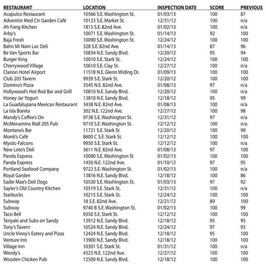 | How do Mid-county restaurants rate? There are approximately 3000 restaurants in Multnomah County; 350 in Mid-county. Multnomah County Health Department Environmental Health Specialists conduct unannounced inspections of food service establishments. These inspectors ensure food safety by evaluating food worker habits and practices; where food comes from and how it is stored in the restaurant; how food is prepared and cooked; and cooling, holding and reheating temperatures. Inspectors report observed violations that are not in compliance with Oregon Revised Statute 624 and Oregon Administrative Rule. This law and these rules are designed to identify violations that can contribute to food borne illness. Priority violations unable to be corrected at the time of the inspection must be corrected within fourteen days and verified by a re-inspection. A safe, alternative procedure must be in place until the final correction is completed. A restaurant must receive a score of 70 to pass the inspection. Re-inspections are not scored. Customers will find a placard on the restaurant entrance that indicates if a facility passed the last routine health inspection. To look up any restaurant in Multnomah County visit this site: http://www3.multco.us/MCHealthInspect/ListSearch.aspx Here are recent results for restaurants in Mid-county.
