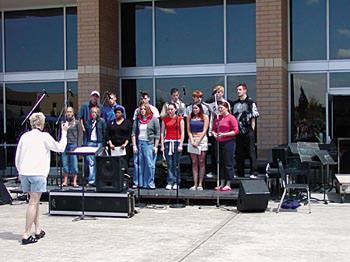 | The Parkrose Debonaires singing group, conducted by Lesley McKinnon, performs for the audience. |