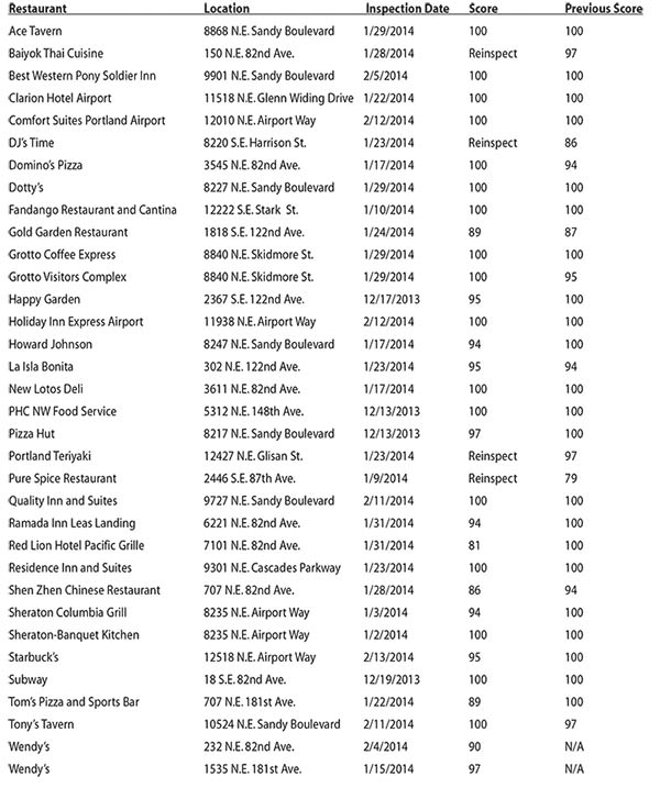 | How do Mid-county restaurants rate? There are approximately 3000 restaurants in Multnomah County, about 350 in east Portland. Multnomah County Health Department Environmental Health Specialists conduct unannounced inspections of food service establishments. These inspectors ensure food safety by evaluating food worker habits and practices, where food comes from and how it is stored in the restaurant, how food is prepared and cooked, cooling, holding and reheating temperatures. Inspectors report observed violations that are not in compliance with Oregon Revised Statute 624 and Oregon Administrative Rule. This law and these rules are designed to identify violations that can contribute to food-borne illness. Priority violations unable to be corrected at the time of the inspection must be corrected within 14 days and verified by a re-inspection. A safe, alternative procedure must be in place until the final correction is completed. A restaurant must receive a score of 70 to pass the inspection. Re-inspections are not scored. Customers will find a placard on the restaurant entrance that indicates if a facility passed the last routine health inspection. To look up any restaurant in Multnomah County visit this site: http://www3.multco.us/MCHealthInspect/ListSearch.aspx Here are recent results for restaurants in Mid-county.