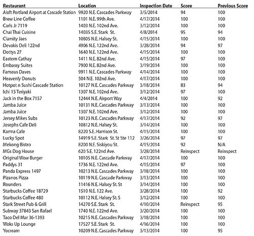 | How do Mid-county restaurants rate? There are approximately 3000 restaurants in Multnomah County, about 350 in east Portland. Multnomah County Health Department Environmental Health Specialists conduct unannounced inspections of food service establishments. These inspectors ensure food safety by evaluating food worker habits and practices, where food comes from and how it is stored in the restaurant, how food is prepared and cooked, cooling, holding and reheating temperatures. Inspectors report observed violations that are not in compliance with Oregon Revised Statute 624 and Oregon Administrative Rule. This law and these rules are designed to identify violations that can contribute to food-borne illness. Priority violations unable to be corrected at the time of the inspection must be corrected within 14 days and verified by a re-inspection. A safe, alternative procedure must be in place until the final correction is completed. A restaurant must receive a score of 70 to pass the inspection. Re-inspections are not scored. Customers will find a placard on the restaurant entrance that indicates if a facility passed the last routine health inspection. To look up any restaurant in Multnomah County visit this site: http://www3.multco.us/MCHealthInspect/ListSearch.aspx Here are recent results for restaurants in Mid-county.