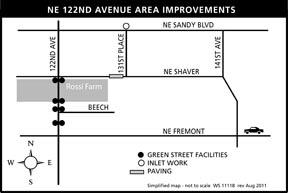 Initial sawcutting was done on the east side of the avenue, followed by cutting on the west side. No vehicle traffic lanes are likely to be closed during preliminary work, however, the sidewalk, parking and bike lanes will be closed. Signs will be set out to notify the public of work in the road. There will also be signs to let cyclists and pedestrians know of closures ahead. Plates and fencing are used over and around excavations during non-construction hours. The bus stop on the east side of 122nd Avenue near Shaver Street will move a little further south to accommodate the new stormwater runoff collector. The work on 122nd Avenue is expected to take at least 10 weeks. Upon completion, Brandt will install 10 curb extensions with planters and five curb extensions on Northeast Fremont Street between 156th and 158th Avenues. For more information or if you have questions, call Environmental Services' Kate Goudschaal at 503-823-2827 or e-mail her at kate.goudschaal@portlandoregon.gov. |